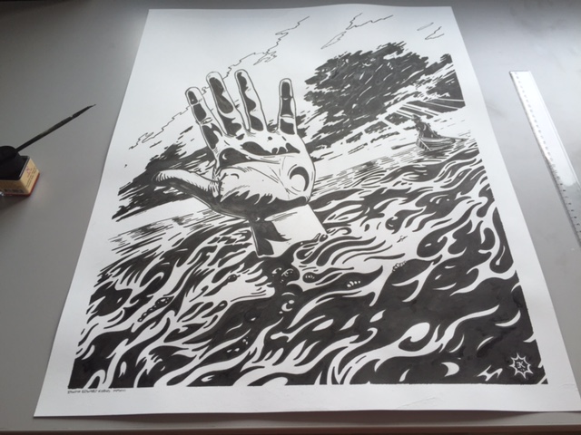 ‘Drenkeling’ is een vrij werk. De hand werd getekend naar voorbeeld van mijn eigen hand, de rest is aan de fantasie ontsproten. Kijk goed naar de golfen en je wordt er welhaast zeeziek van.