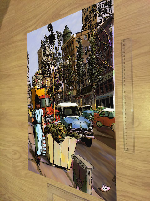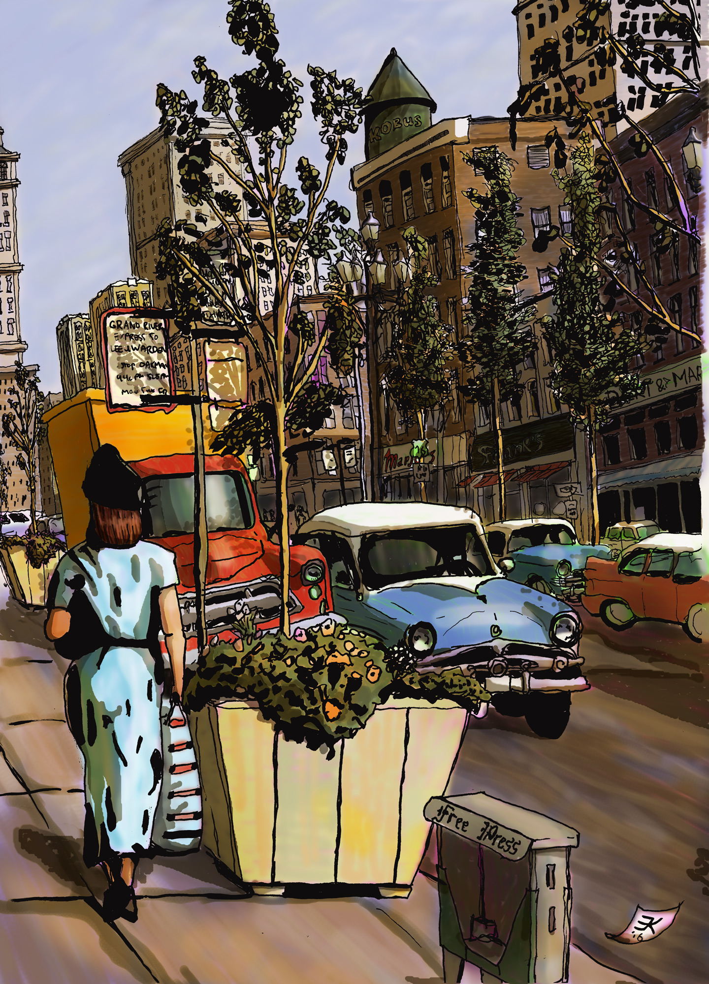 Impressie van een straat in Detroit tijdens de gloriejaren. High quality art print, op basis van een met de hand (links!) gemaakte tekening, digitaal ingekleurd.