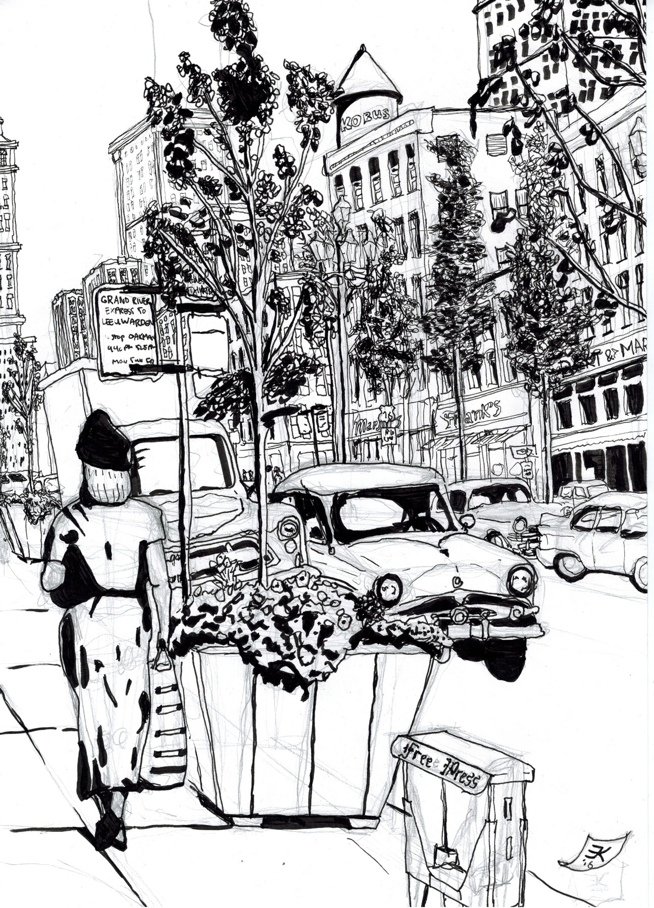 Het beeld is geïnspireerd op oude zwart-witfoto’s van Detroit. Toch betreft het hier geen 1 op 1 benadering van de werkelijkheid. Het is een vrije interpretatie waarbij de compositie van de tekening en alle aanwezige elementen zijn geschikt naar de wil van de maker.