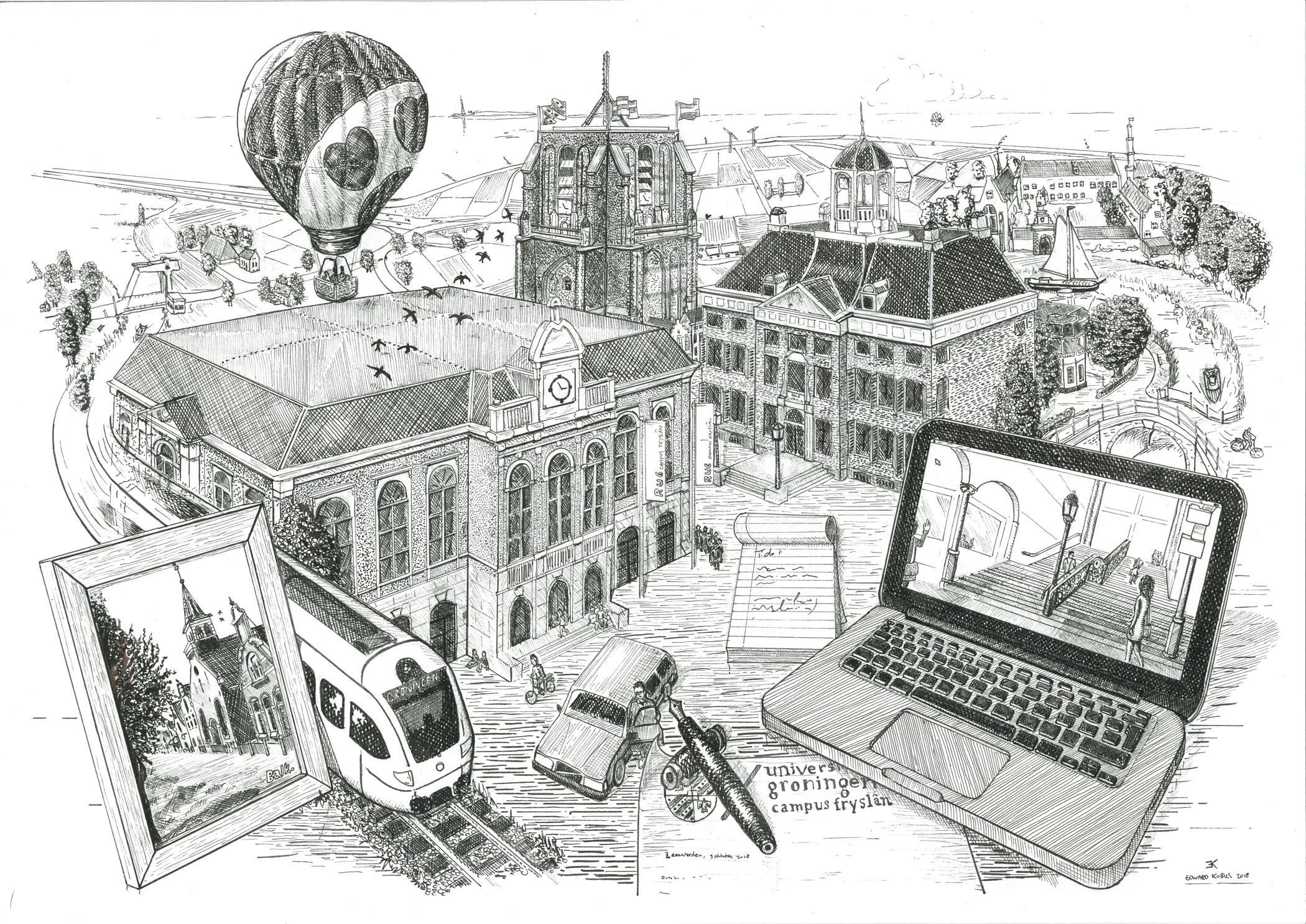 Wie goed naar de pentekening kijkt, ziet de voormalige universiteit van Franeker midden tussen de Friese weilanden. Maar ook het Stadhuis van Leeuwarden, de scheve toren De Oldehove en natuurlijk het Beursgebouw, het onderkomen van de Campus Fryslân, hebben een prominente plek.