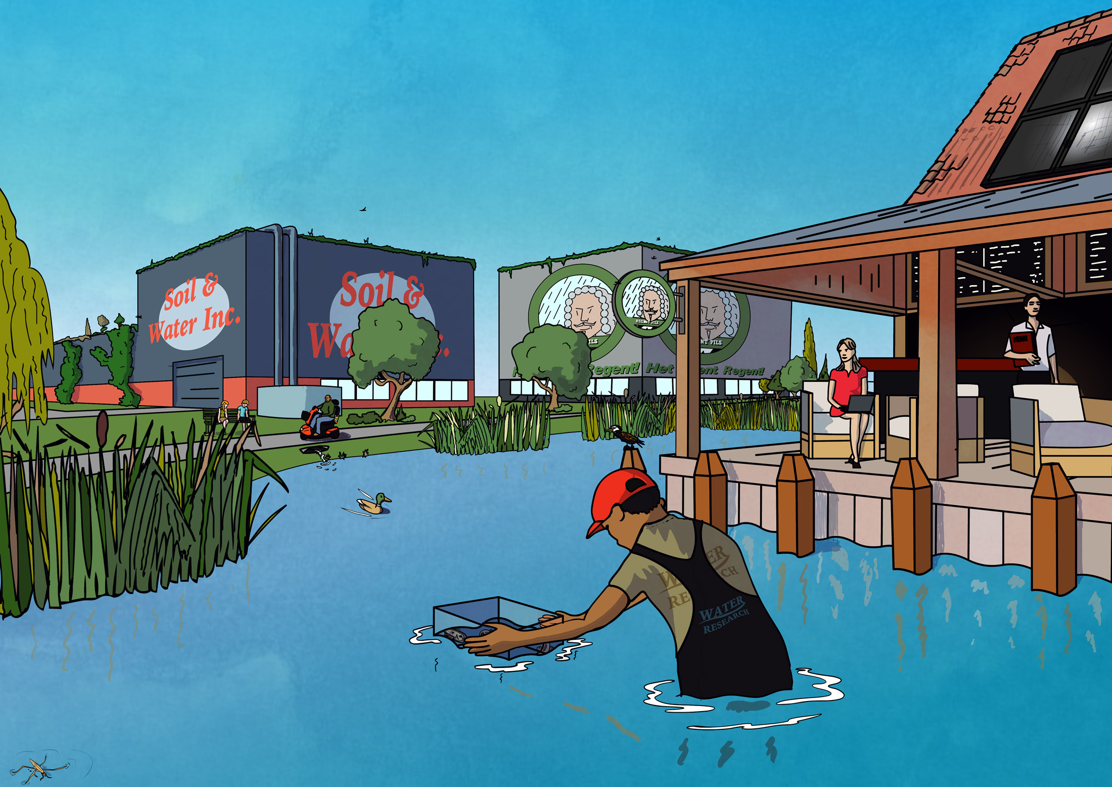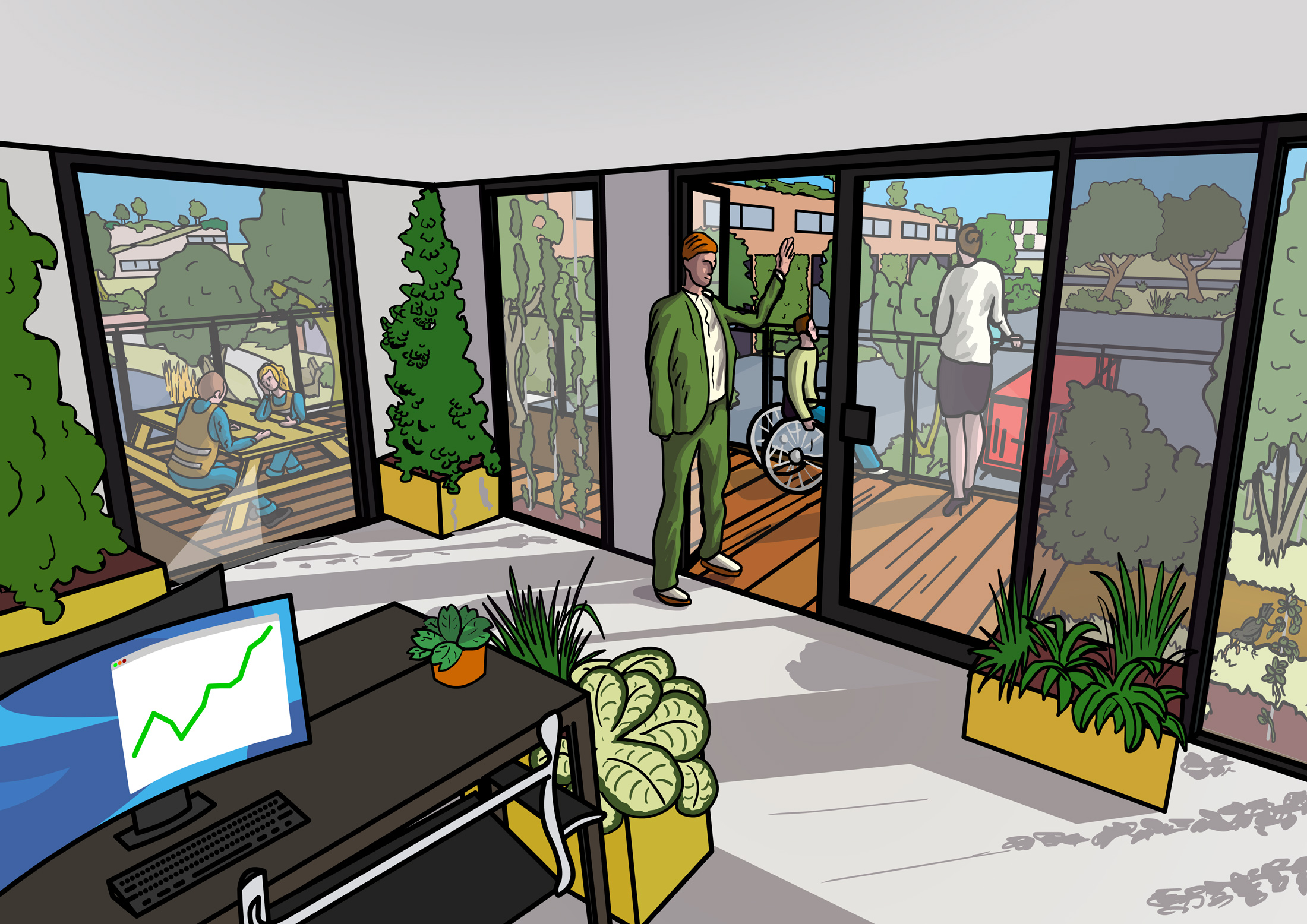 In opdracht van Wageningen University and Research werkte Studio Edward Kobus een aantal artist impressions uit om te laten zien hoe de werklandschappen van de toekomst eruit kunnen komen te zien.