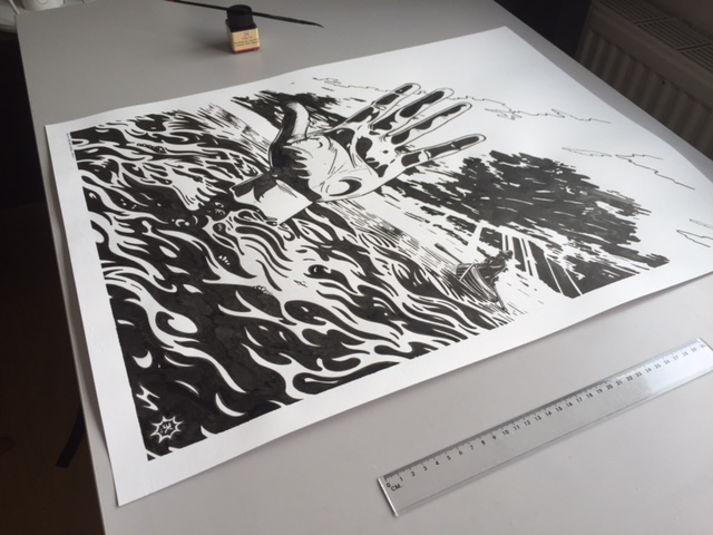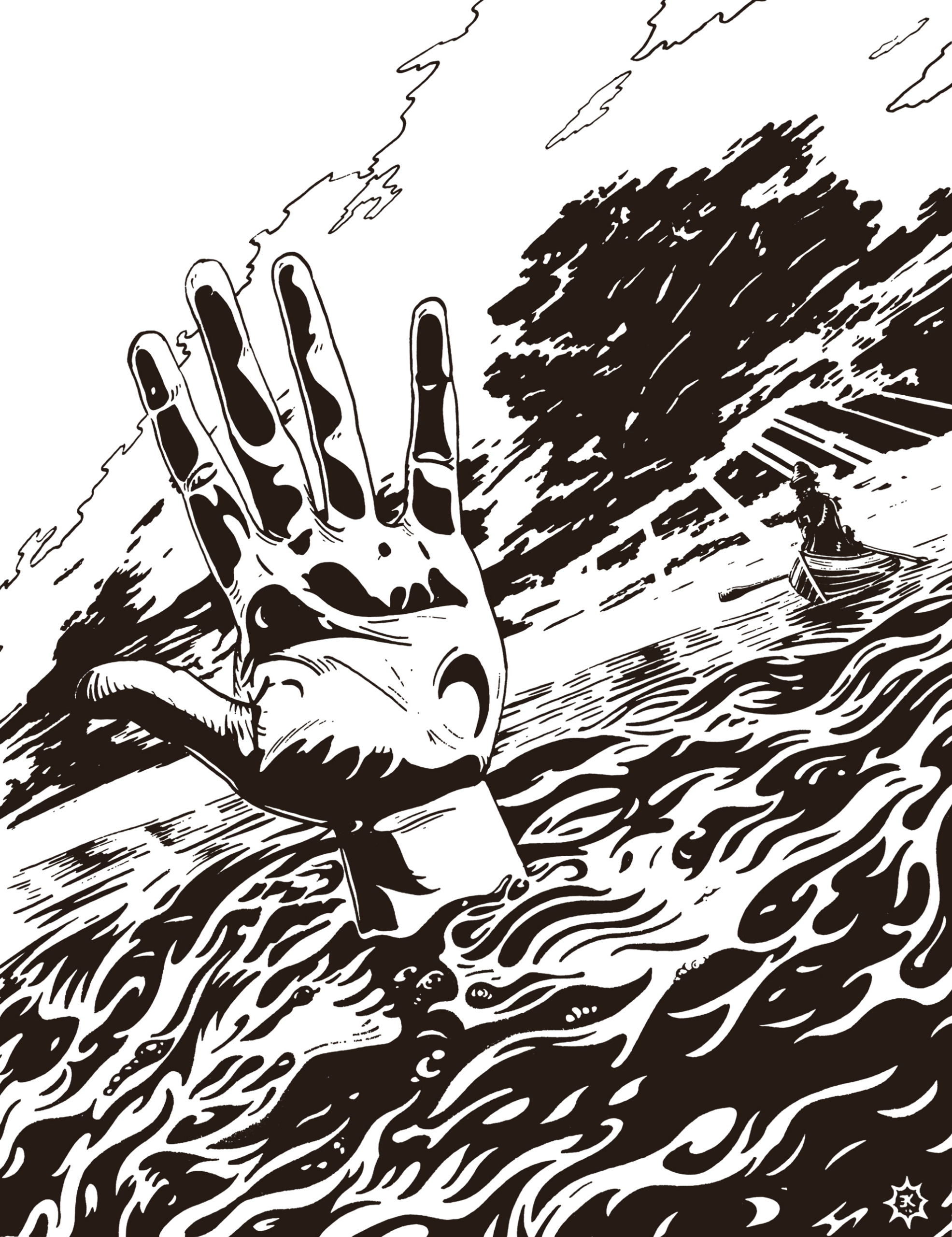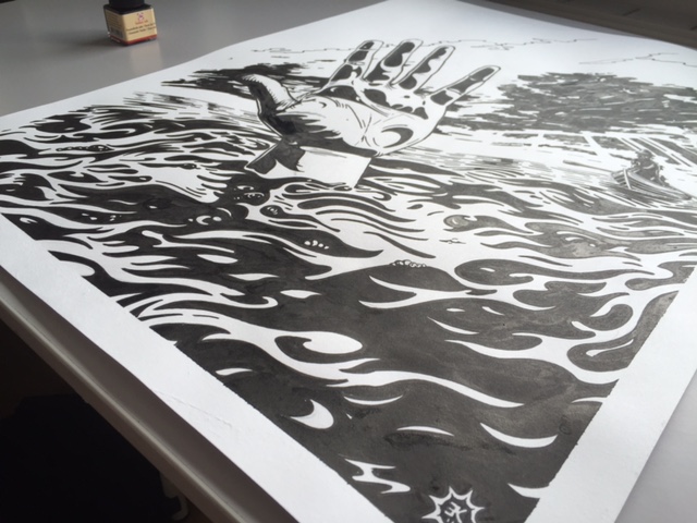 ‘Drenkeling’ is een vrij werk. De hand werd getekend naar voorbeeld van mijn eigen hand, de rest is aan de fantasie ontsproten. Kijk goed naar de golfen en je wordt er welhaast zeeziek van.