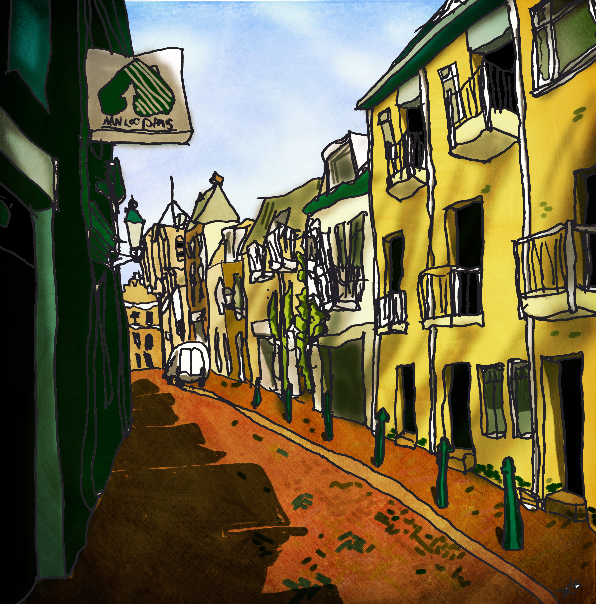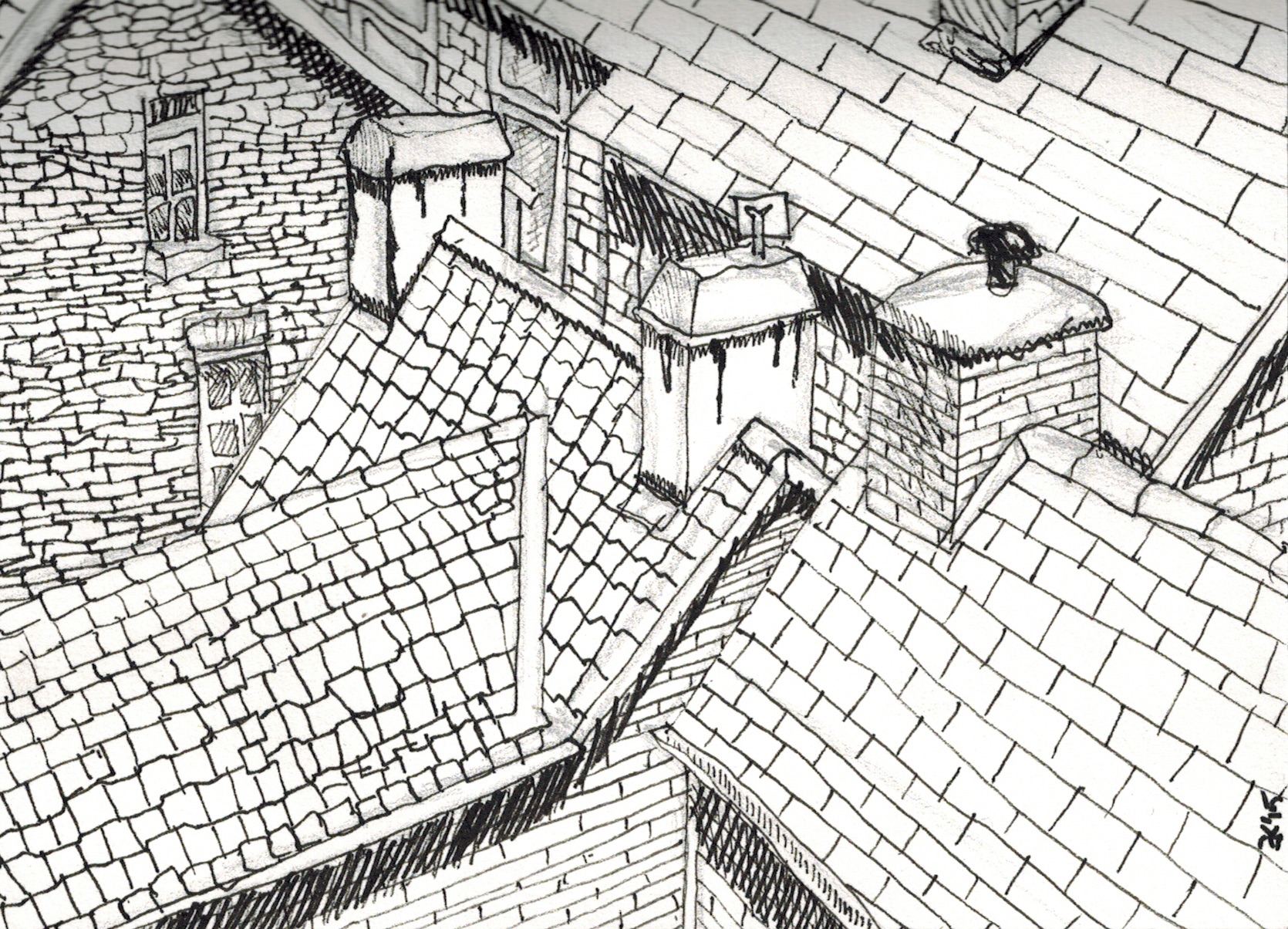 Gebouwen zijn vaak een verzameling aan elkaar klevende geometrische vormen. Strak en voorspelbaar, zeker als ze gedateerd zijn in de jaren ’70 of later. Maar dat hindert niks. Op een tekening kan alle dode materie voorzien worden van een ziel. Misschien wel een stukje ziel van de tekenaar. Houdt die immers niet van dit soort stukjes vergeten stad?