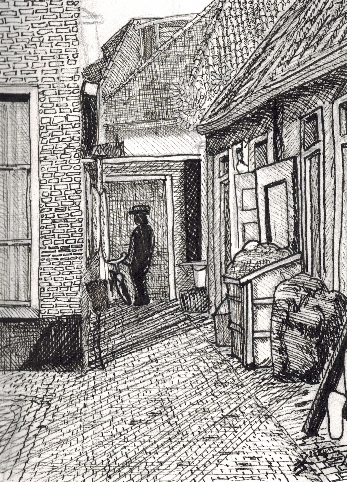 Gebaseerd op een foto uit 1920, een blik op een buurtje dat niet meer bestaat: De armoedige Boterhoek in Leeuwarden. Aan de voet van de Oldehove.