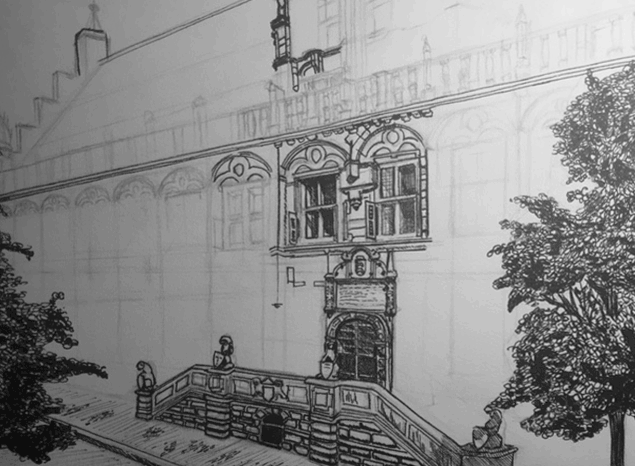 Wat mij betreft het hoogtepunt van deze week: Een pentekening van de Kanselarij te Leeuwarden. Een pand uit de renaissance, gebouwd om recht in te spreken. Recent zat het Fries Museum hier nog, tegenwoordig verschansen zich hier bedrijven.
