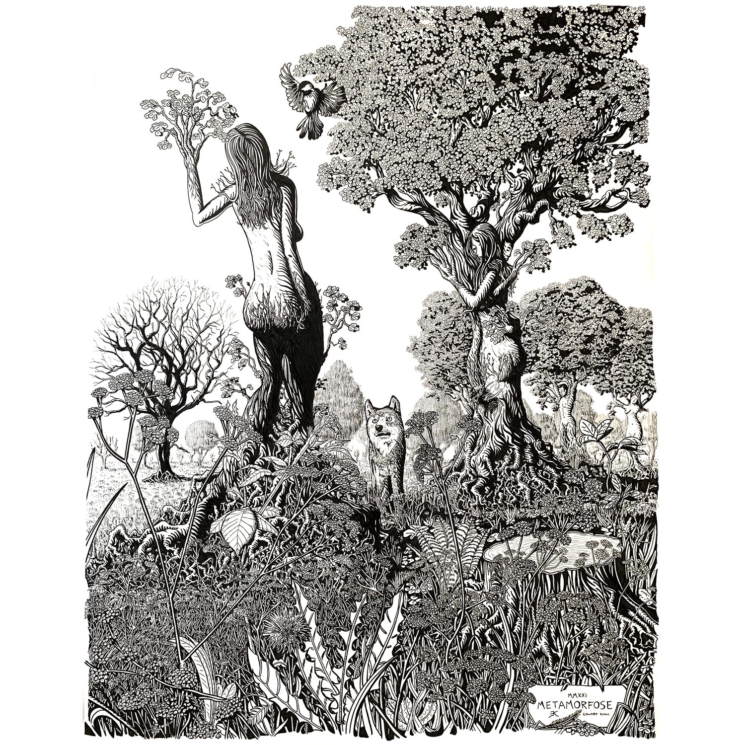 Wat te denken van de tekening ‘Metamorfose’. Mensen die in bomen veranderen. Dat zou je kunnen zien als een symbool voor vereenzaming. Of tot stilstand komen.