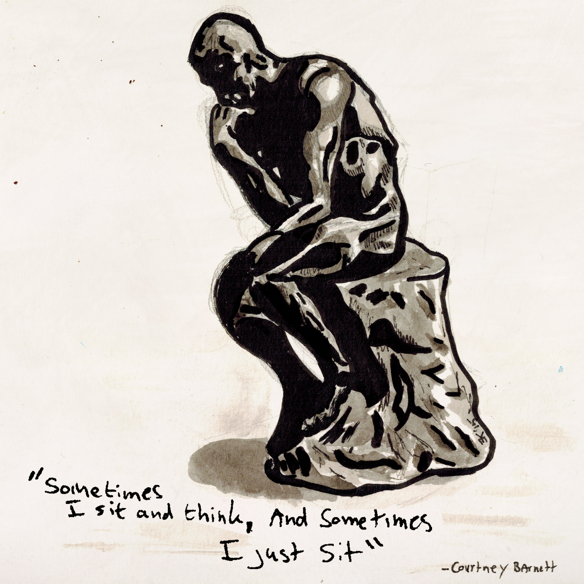 Het onderwerp van deze tekening was de plaat ‘Sometimes I Sit and Think, and Sometimes I just Sit’ van de Australische zangeres Courtney Barnett. Een mooie relativerende titel, die het meesterwerk van Rodin ineens een andere lading meegeeft.