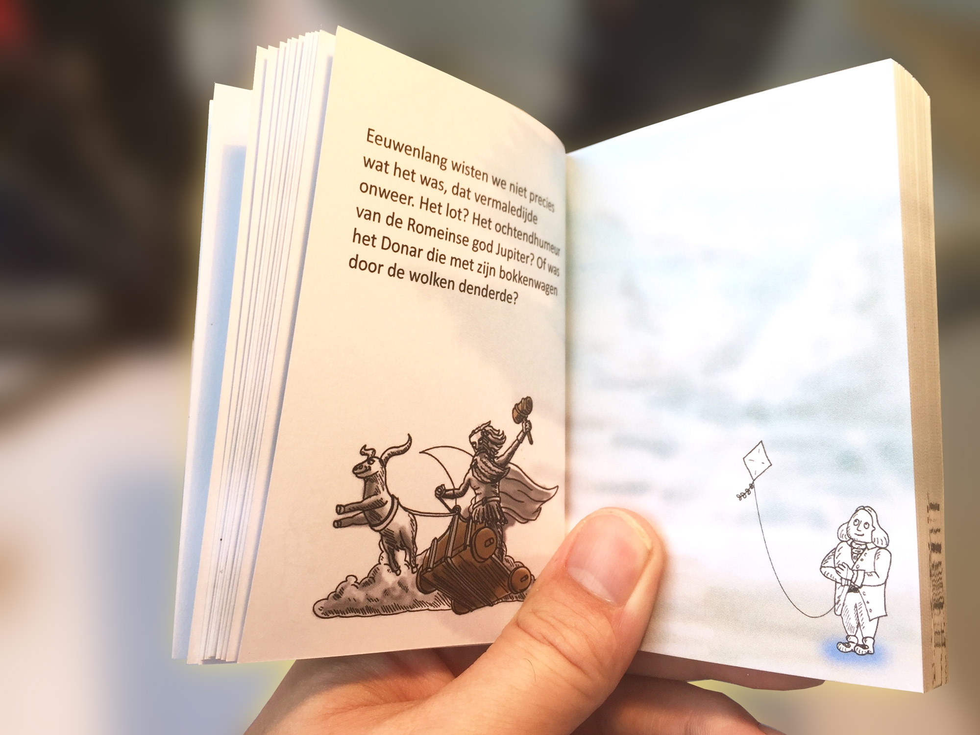 In het boekje over de Onweer 3.0 belicht het bedrijf niet alleen de expertise van Van der Heide, maar laat het ook op speelse wijze de geschiedenis van de onweersbestrijding zien. Van zwarte kippen die in de middeleeuwen over kerken werden gegooid tot de angst voor Donar die met zijn bokkenwagen over de wolken banjerde. In woord en beeld.