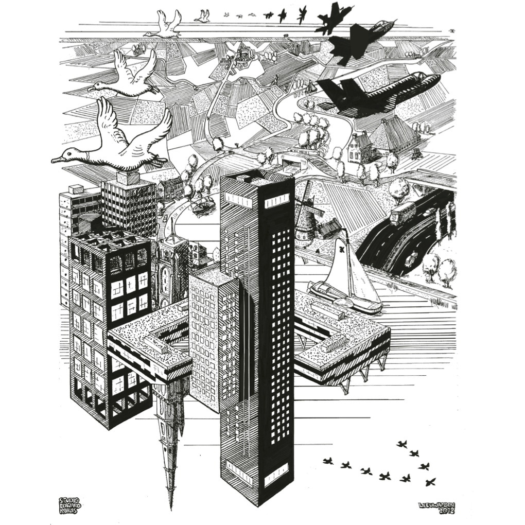 In opdracht van de afdeling International Affairs, onderdeel van hogeschool NHL Stenden, maakte Studio Edward Kobus deze tekening: Een ode aan Escher waarin zijn geboortestad Leeuwarden centraal staat. De stad en de directe omgeving zijn geportretteerd met een knipoog naar het werk van de meester graficus.