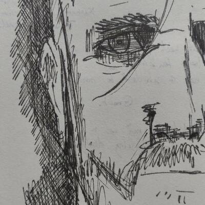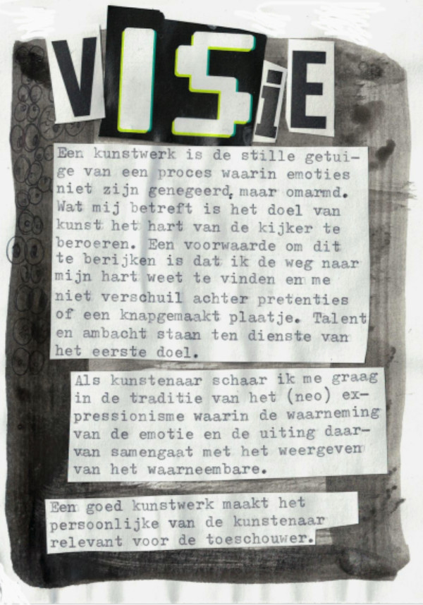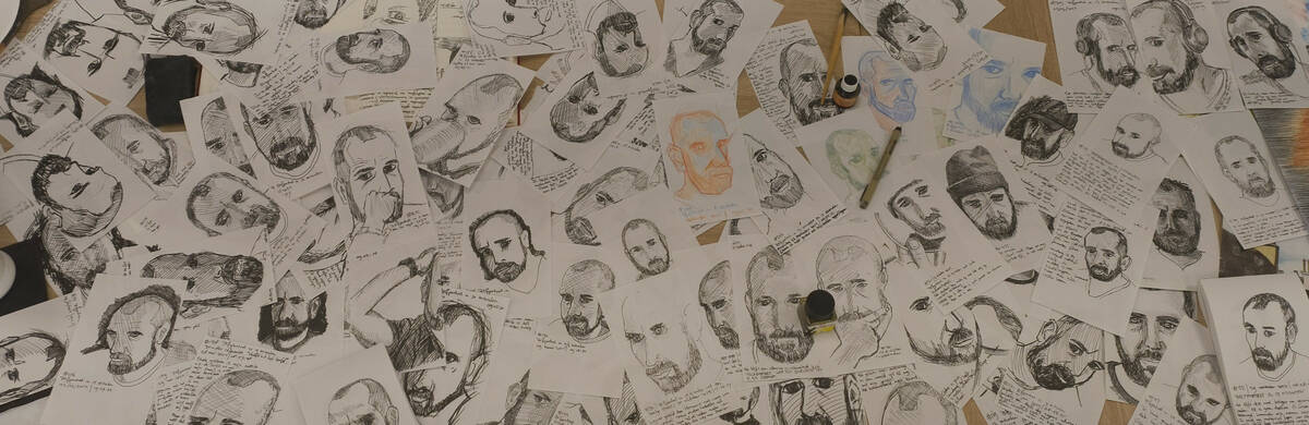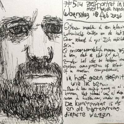 Een typische dag in mijn atelier begint met het maken van een zelfportret. In maximaal vijftien minuten probeer ik mijn gezicht te vertalen naar inkt op papier. Langzaam vormt zich een soort dagboek, dat ik aanvul met tekst.