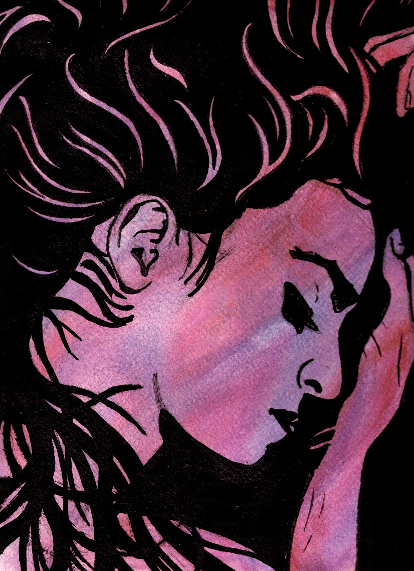 Een verzoeknummer. Eerder had ik al een soortgelijk werk gemaakt met de titel ‘Slapende schoonheid’. Er bleek meer vraag te zijn naar werk in deze stijl waarin ik de scherpe contouren van een gezicht in zwarte inkt afzet tegen een achtergrond op basis van waterverf.