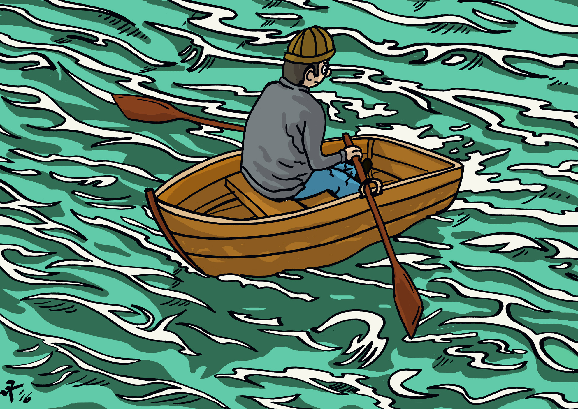 De tekening die symbool staat voor deze maand. Een man in een roeibootje op volle zee. Geen idee waar het heen moet, welke koers er moet worden gezet.