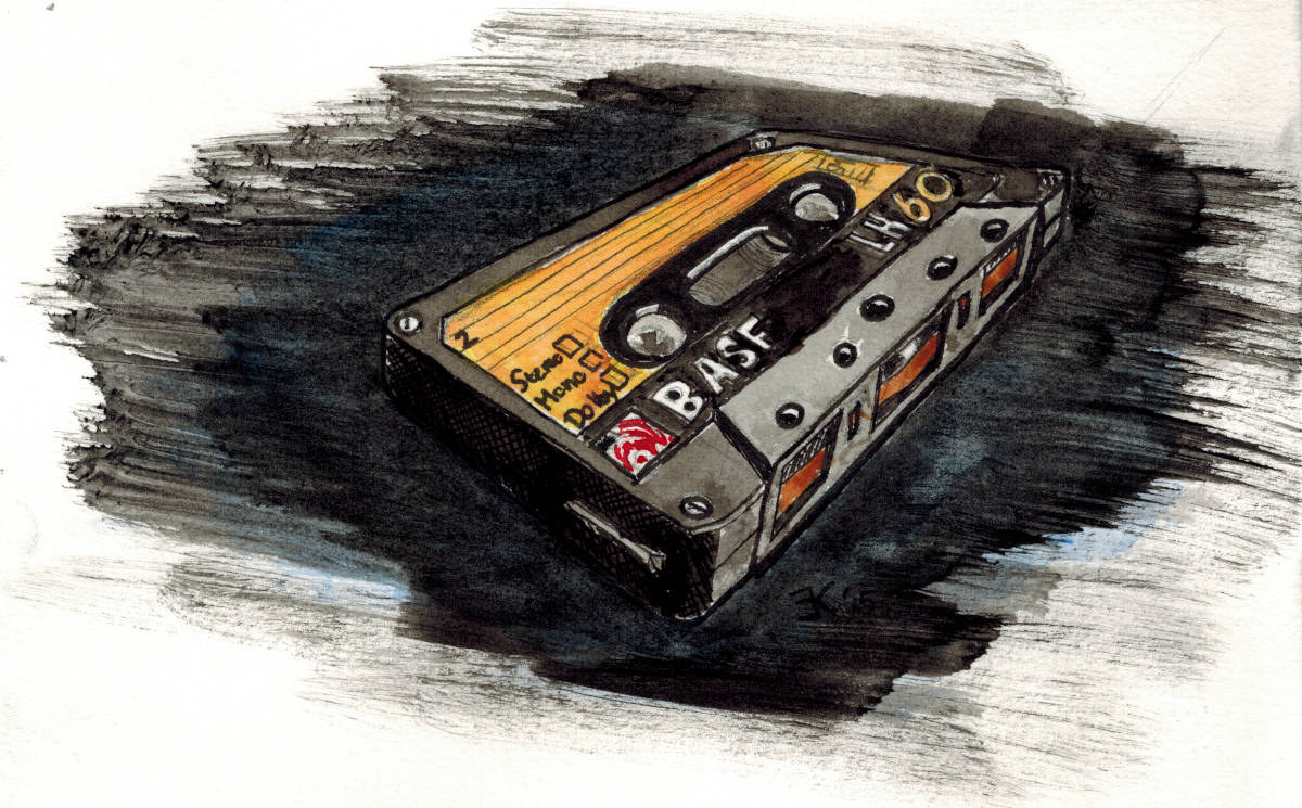 De kleurstelling van de BASF cassettebandjes brengen me terug naar de sfeer van de jaren '80, ofschoon ik van die tijd vrij weinig bewust heb meegekregen. In mijn tijd op het Grafisch lyceum Deltion leerde ik 15 jaar voor dit cassettebandje heel netjes naar realiteit te tekenen. Daar heb ik met deze aquarel mee afgerekend. Het perspectief is overdreven en ik heb heel snel gewerkt.
