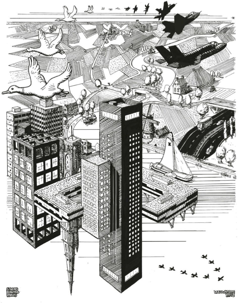 Een aantal kenmerken Leeuwarder landmarks, waaronder natuurlijk de Achmeatoren, spelen de hoofdrol. Een stadse oase temidden van de weilanden, verbonden met water en lucht. F35’s vliegen richting de einder, terwijl vogels je als kijker tegemoet komen. De Oldehove spiegelt zich aan de Bonifatiustoren en een snelweg duikt onder het water door.