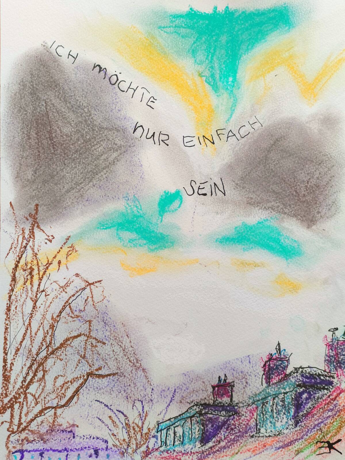 Materiaal: Pastel-, oliekrijt en inkt op papier