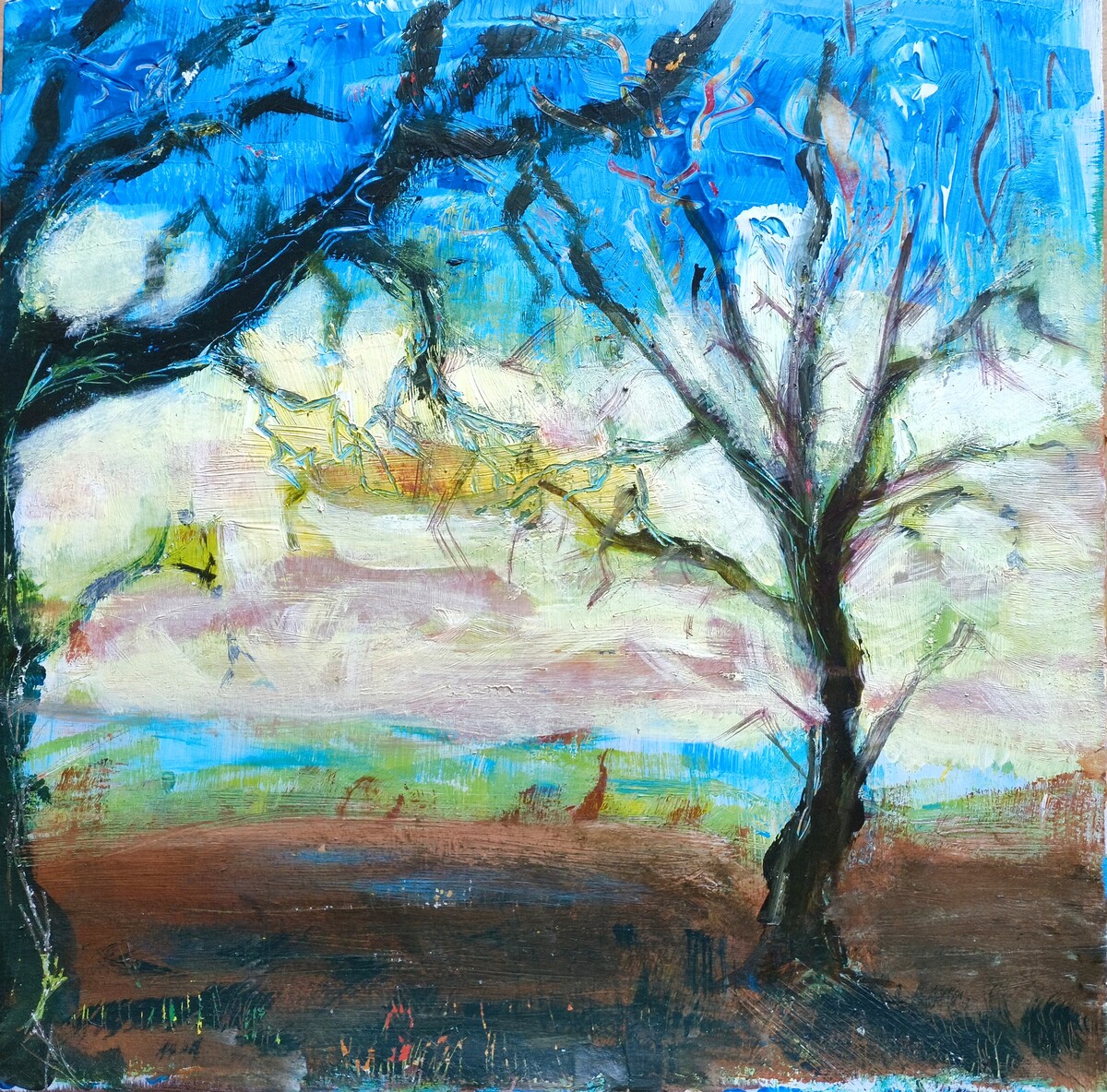 Dit expressionistische landschap met op de voorgrond twee bomen ontstond in het moment.