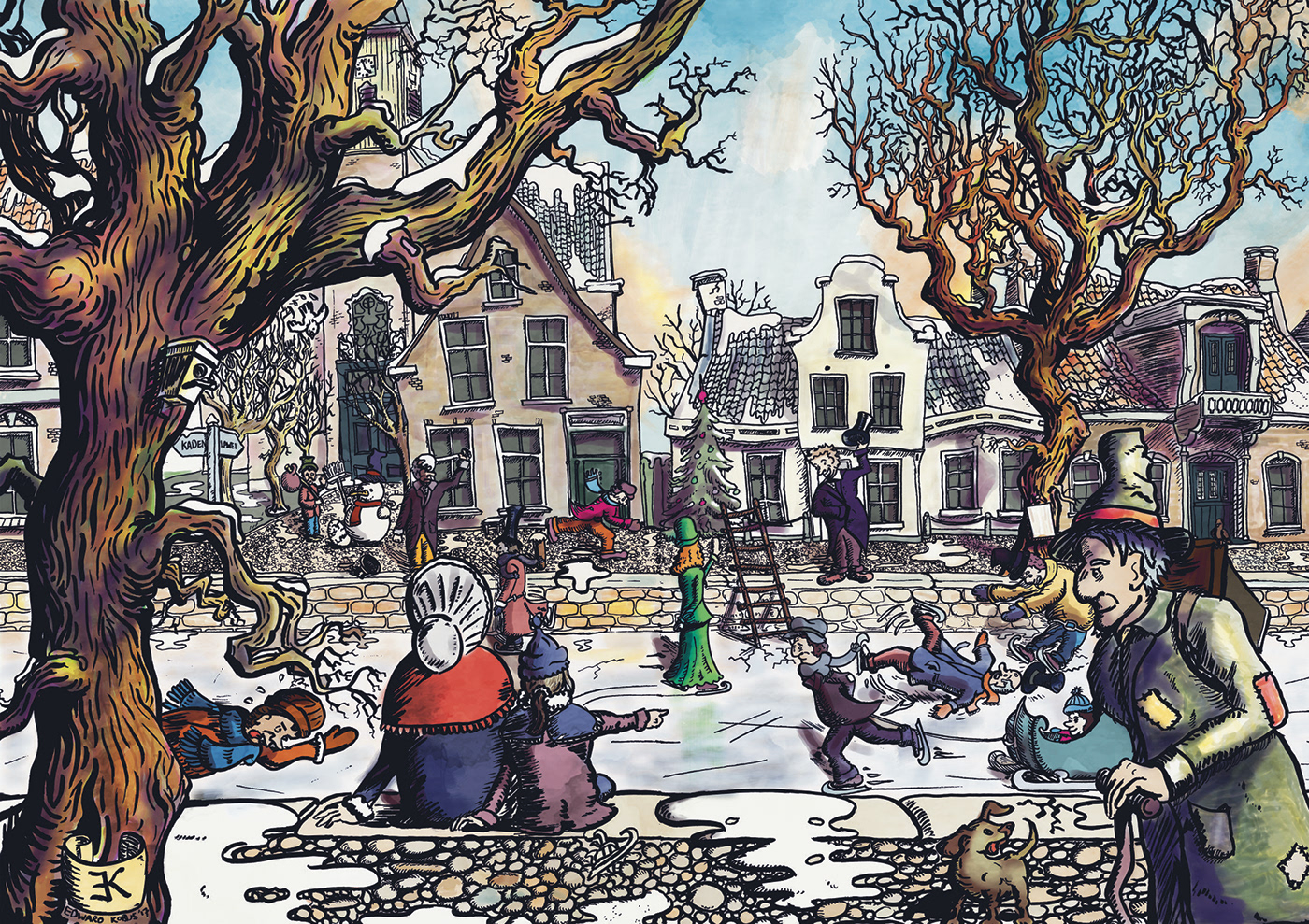 In opdracht van schouwburg De Lawei, in Drachten, mocht Studio Edward Kobus deze tekening maken. Het tafereel, deels geïnspireerd op het werk van Anton Piek, stelt Drachten voor in de 19e eeuw. Een winters tafereel: Schaatsers zwieren over de Drachtstervaart, en jeugdige Drachtster zoekt zijn heil in kattenkwaad.