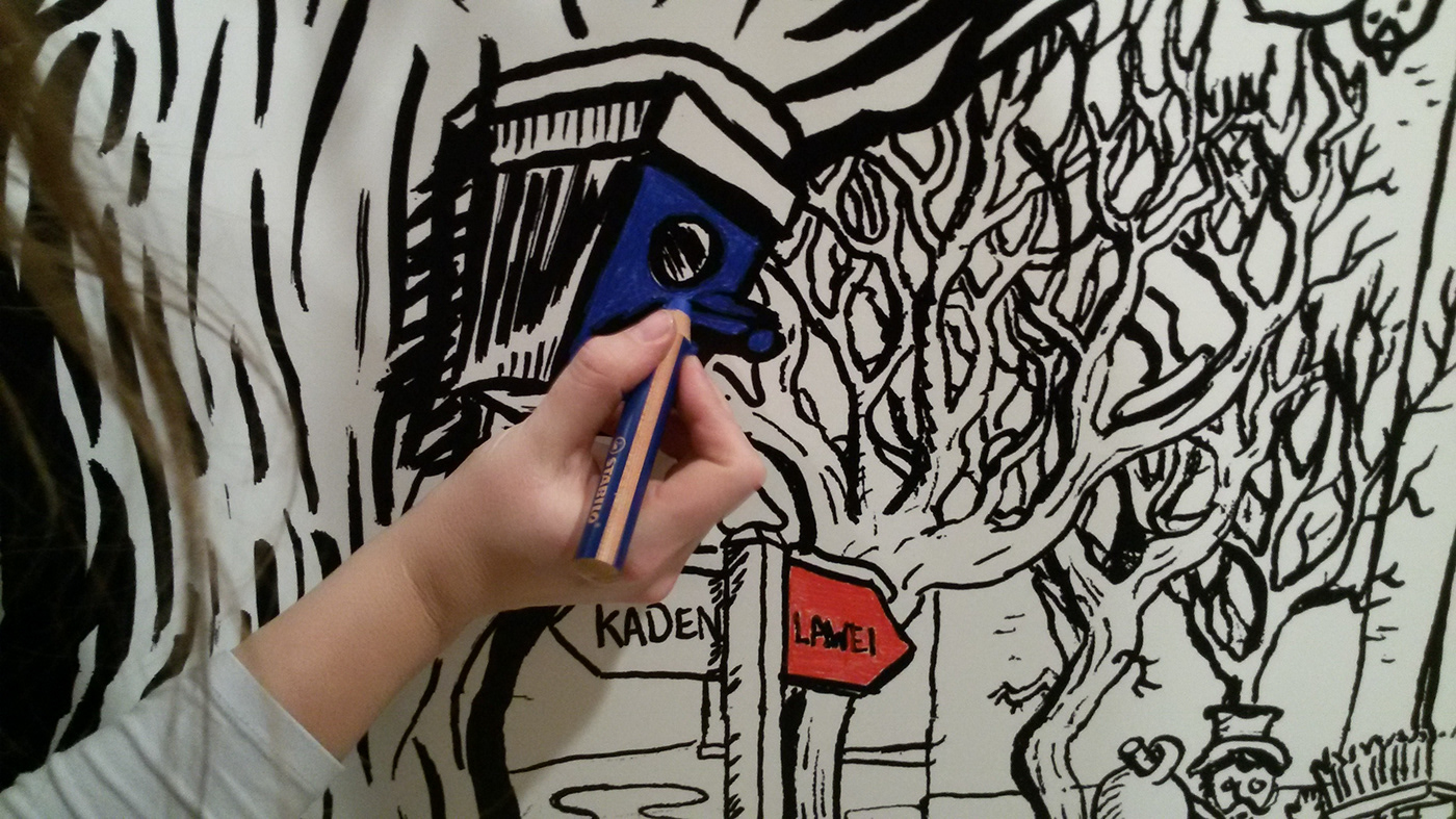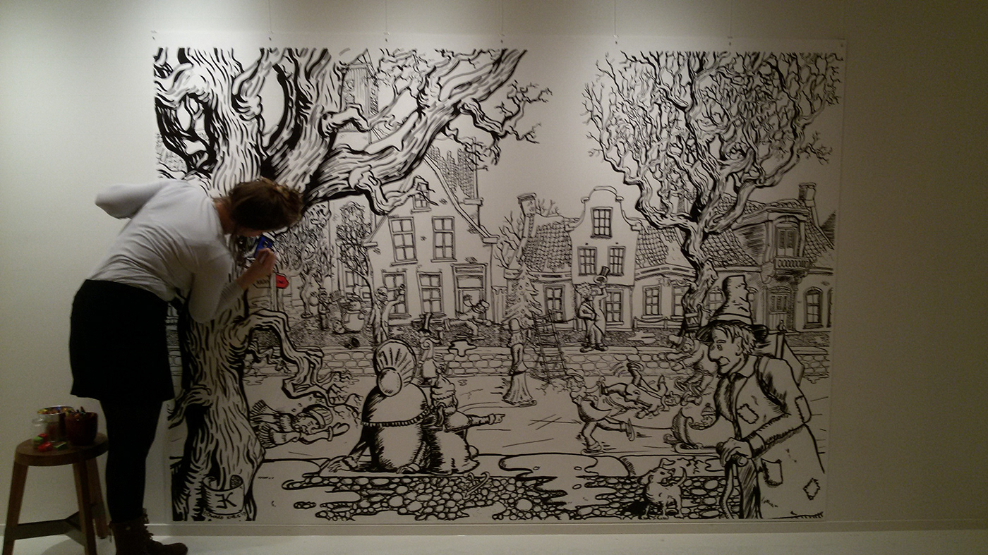 De tekening is handgemaakt met inkt op papier. De zwart-wit tekening is in de foyer van de Lawei opgehangen, bezoekers mochten hem daar inkleuren. Op eigen initiatief heeft Studio Edward Kobus de tekening ook digitaal ingekleurd.