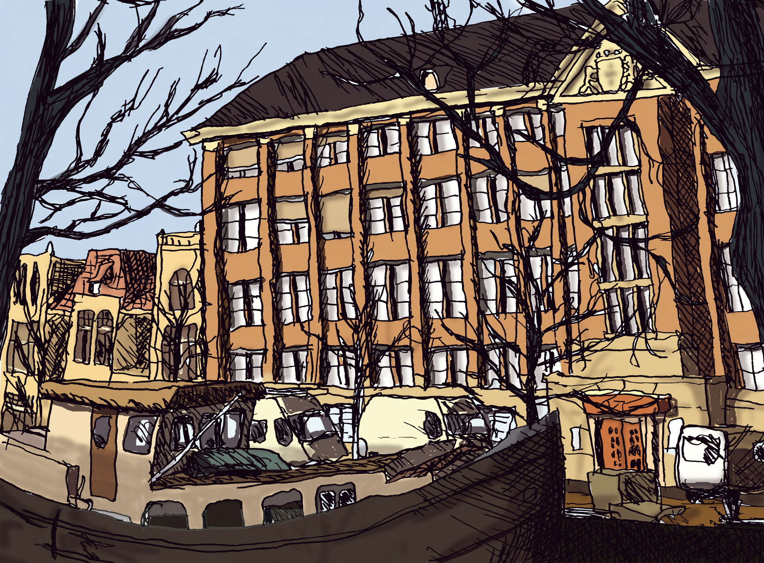 Emmakade, Leeuwarden. Een tekening die ik met links heb gemaakt. Het levert een lekker los beeld op waar ik door op kan bouwen.