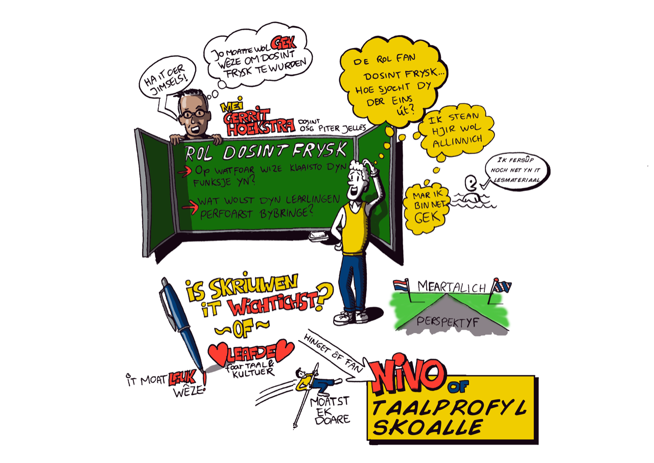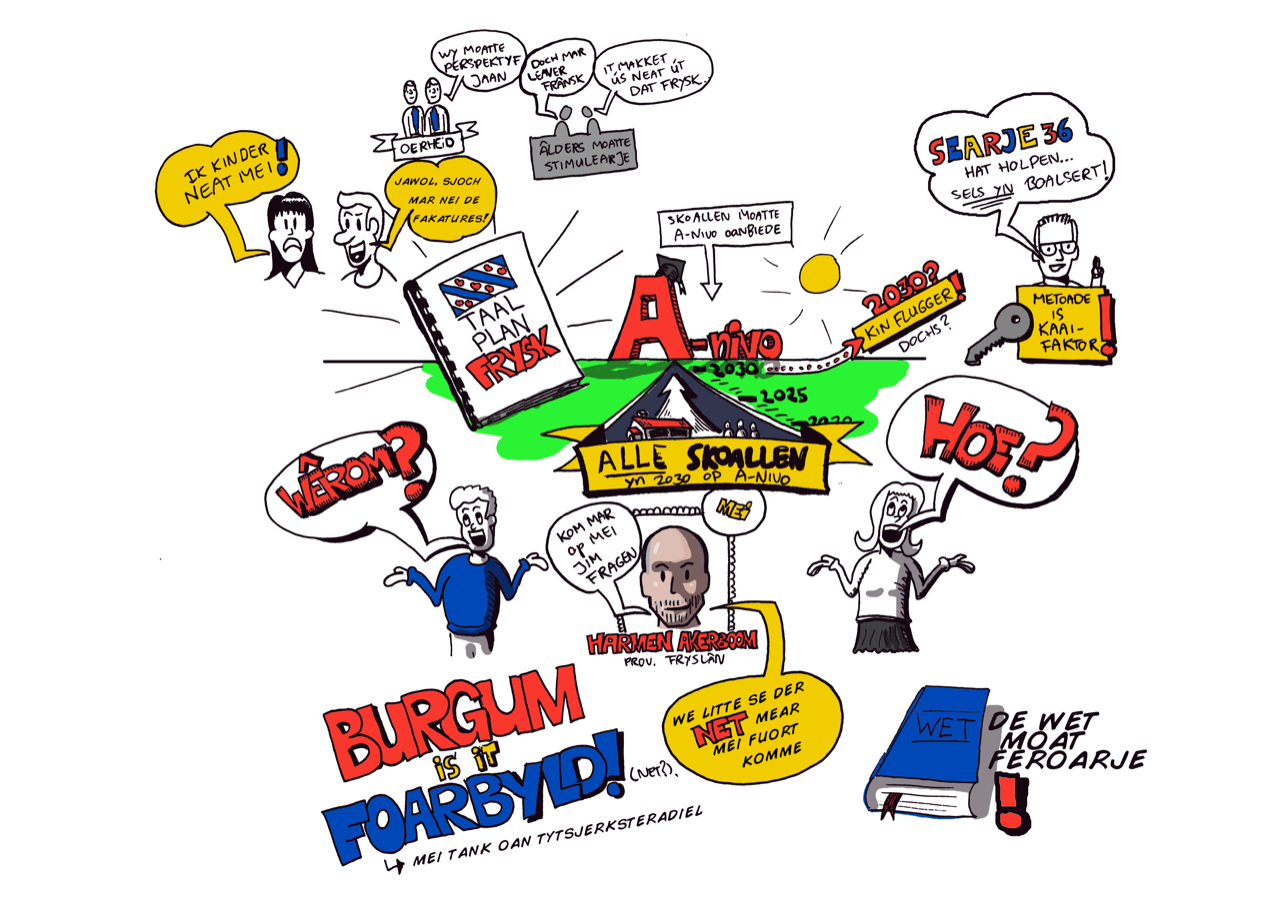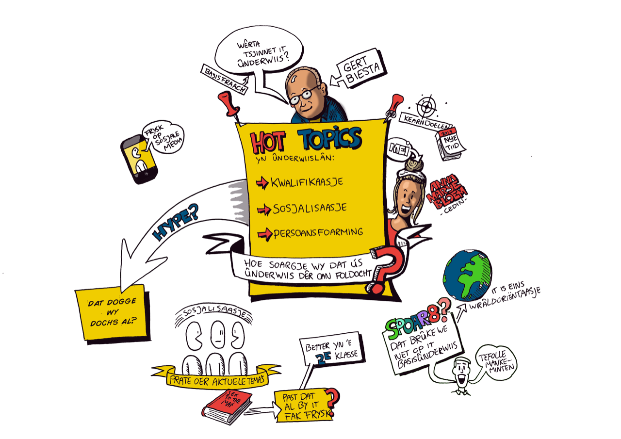 Voor Cedin, een organisatie van bevlogen professionals met hart voor onderwijs en zorg, maakte Studio Edward Kobus meerdere visuele notulen bij een groot keukentafeloverleg over het Fries in het (middelbaar) onderwijs.