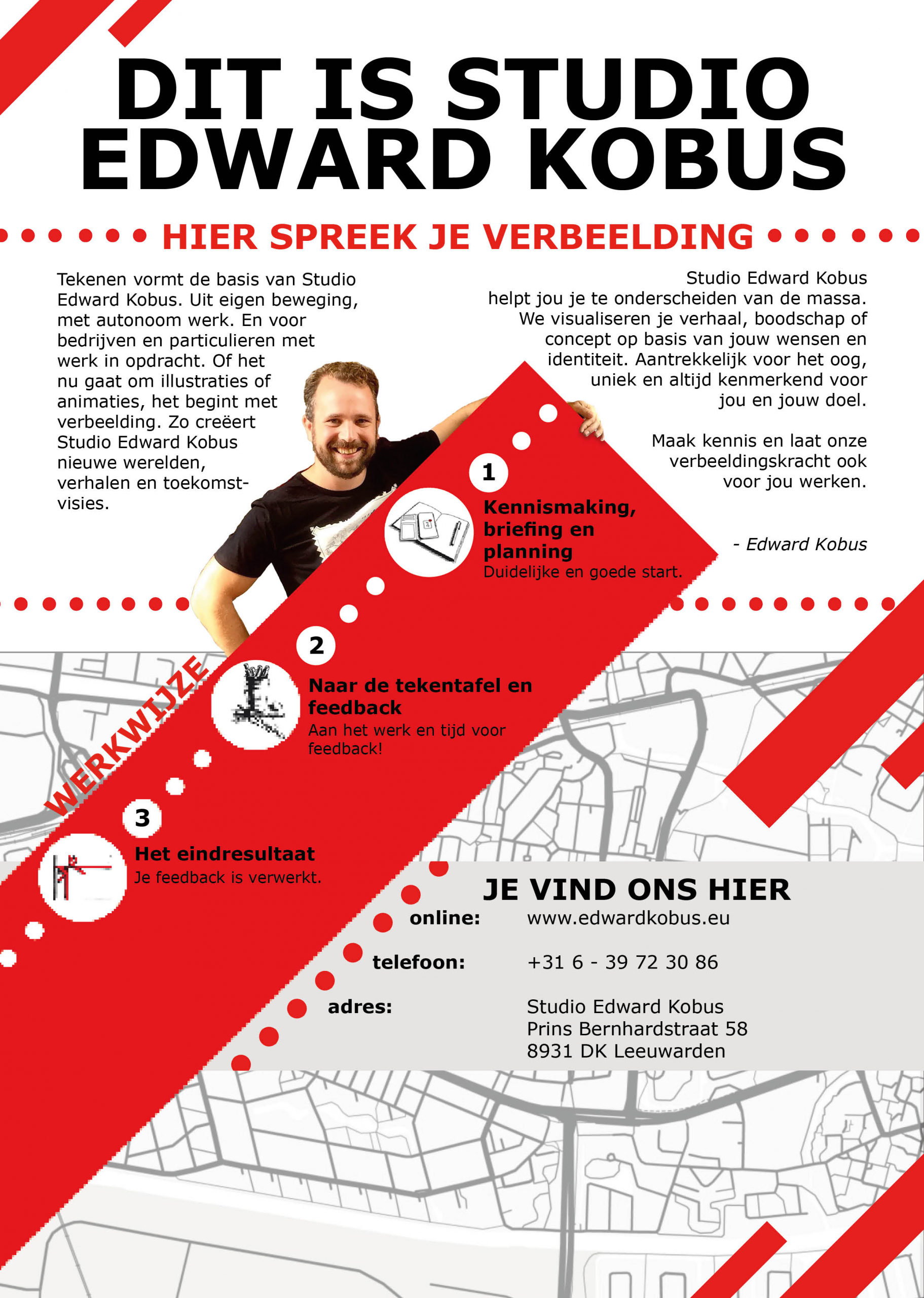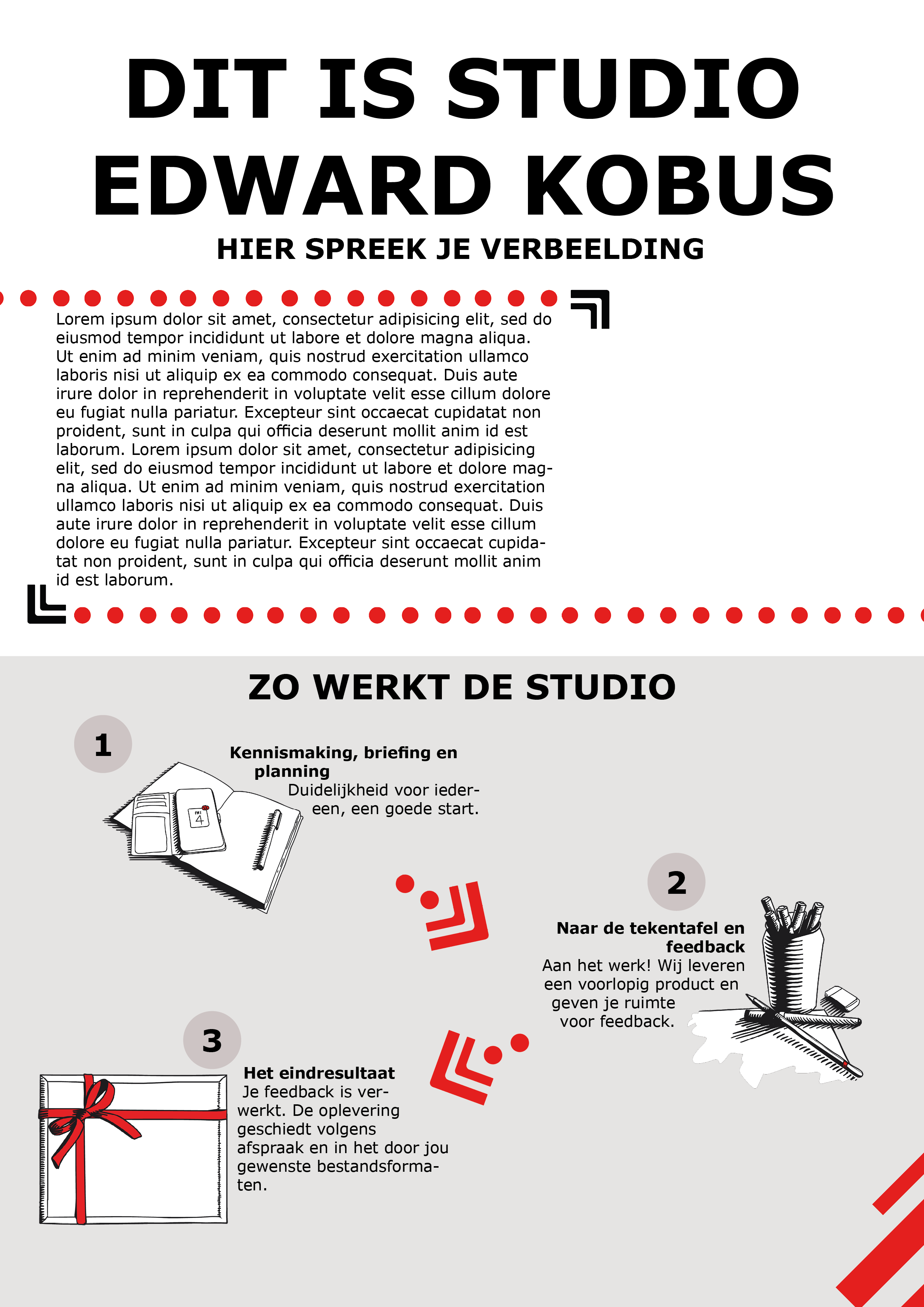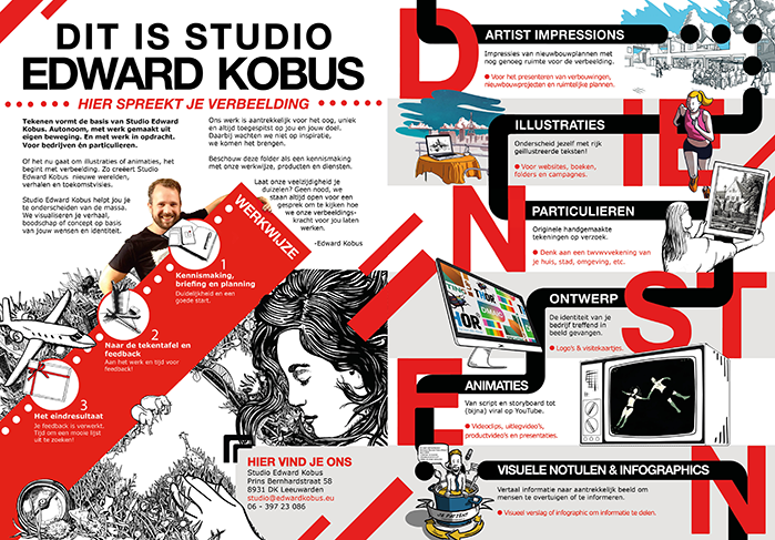 “Studio Edward Kobus had na vier jaar behoefte aan een nieuw ontwerp voor de bedrijfsfolder. Hier mocht ik, bij wijze van stage opdracht, mijn tanden in zetten. Een mooie en omvangrijke opdracht.