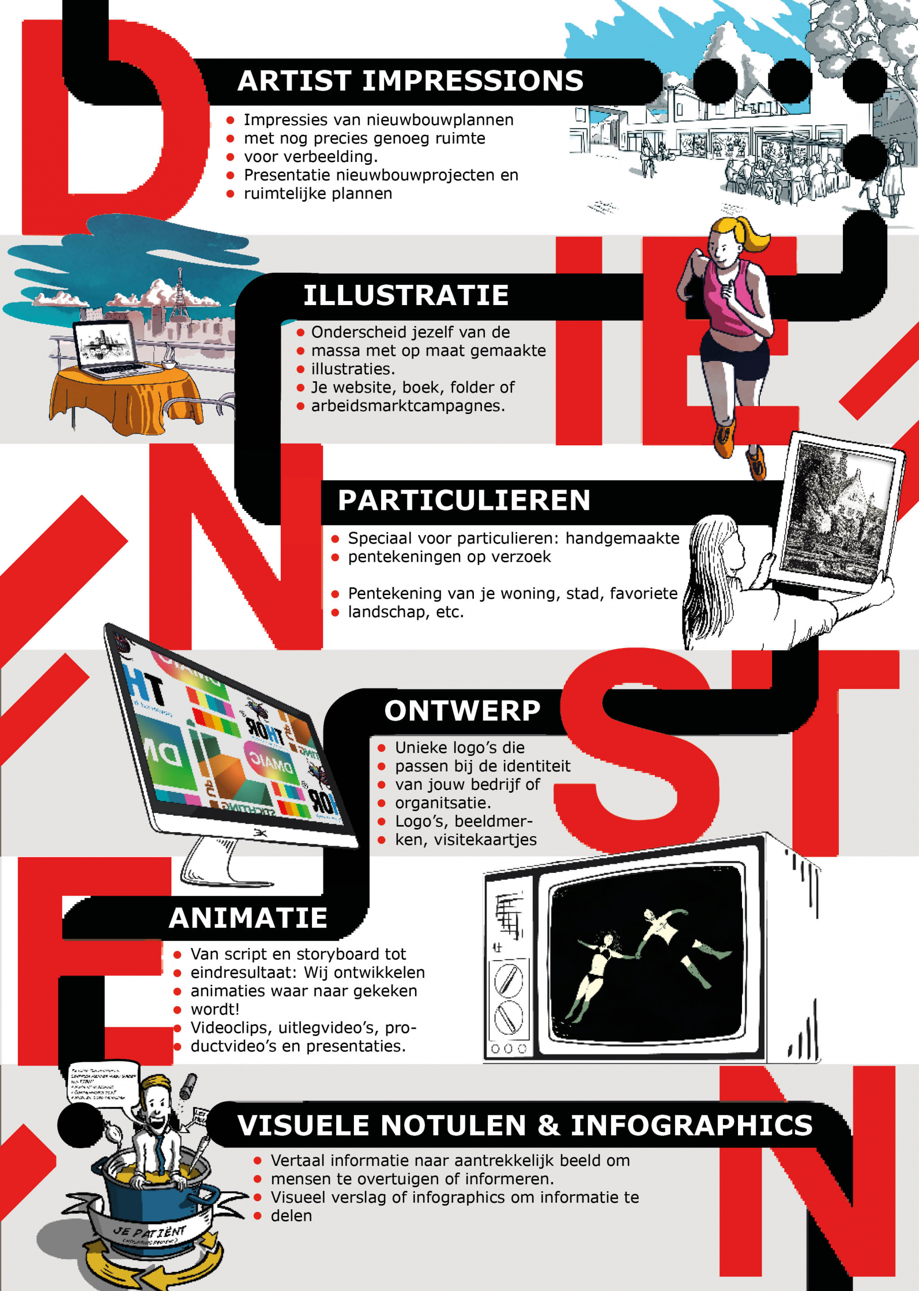 Uiteindelijk is het gelukt om de diensten op één pagina te vatten door gebruik te maken van een soort slangvorm die alle diensten aaneen rijgt. Bij de vorm is de titel van de pagina verwerkt samen met de dienst namen. Het creëerde een aantrekkelijk beeld om door te grasduinen, de slang begeleidt je door het dienstenaanbod.
